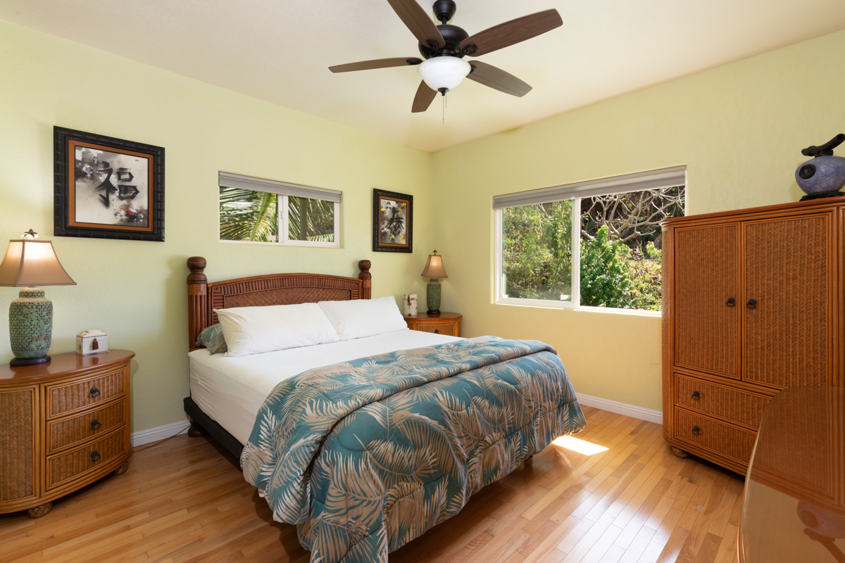 This custom 3-bedroom, 2.5-bath retreat boasts stunning coastline, sunset, and ocean views. Enjoy seamless indoor/outdoor living with 3 spacious lanais, a tiki BBQ patio - ideal for entertaining and enjoying refreshing ocean breezes. Set in a tranquil, rural oasis just 45 minutes south of town, with direct ocean access at bottom of road. Love to play Pickleball? Kona Paradise features two pickleball courts overlooking the ocean and coastline- Did we say Fabulous?